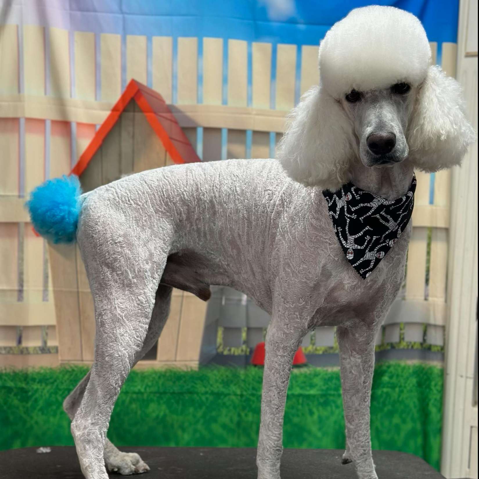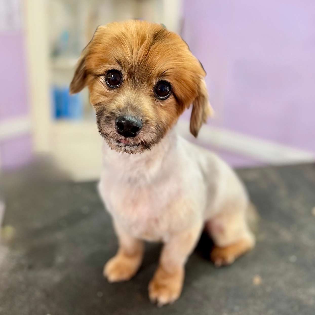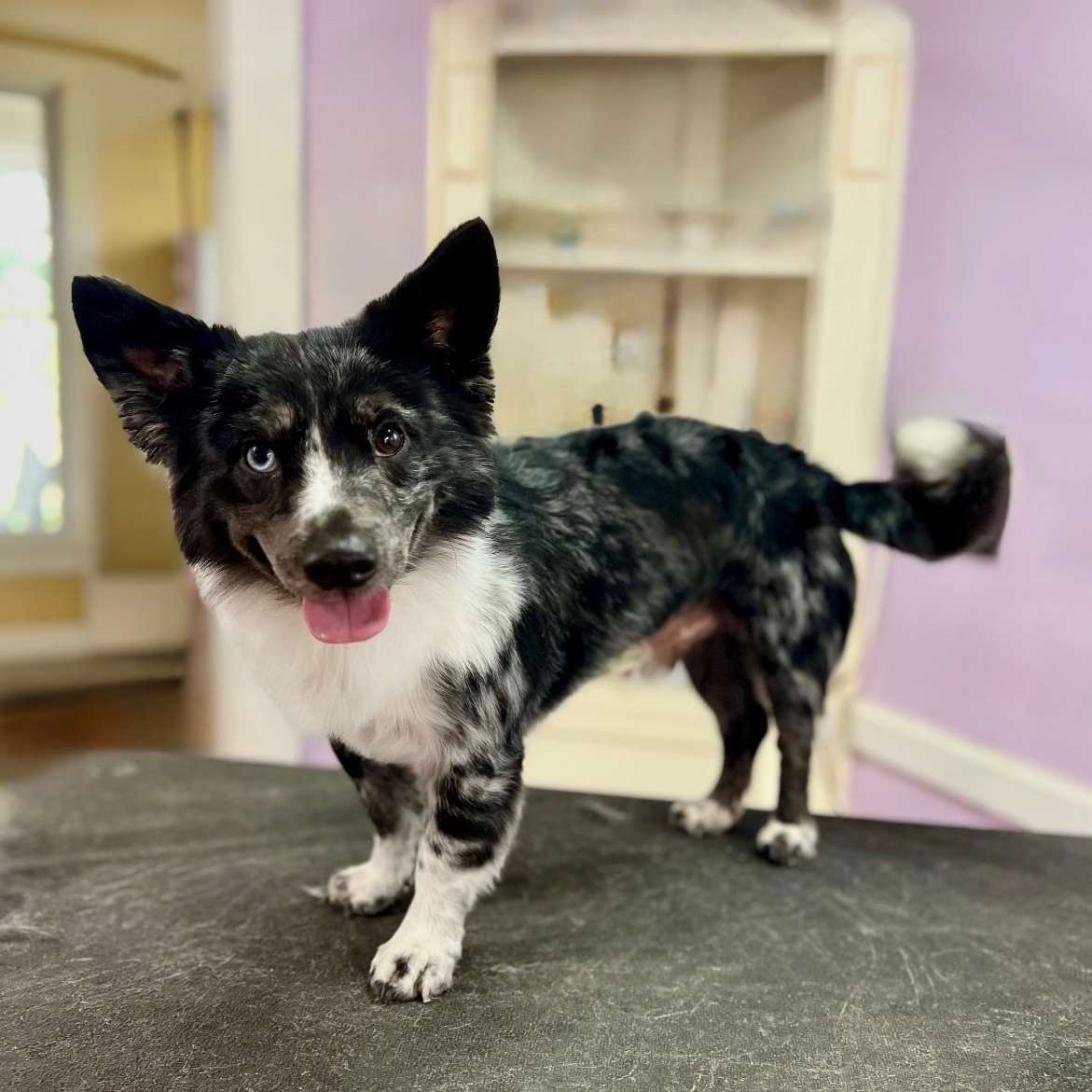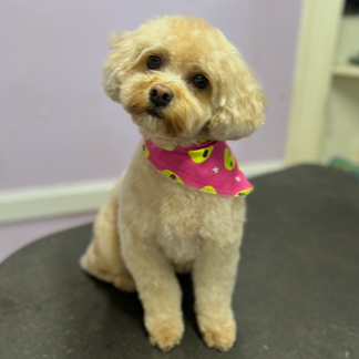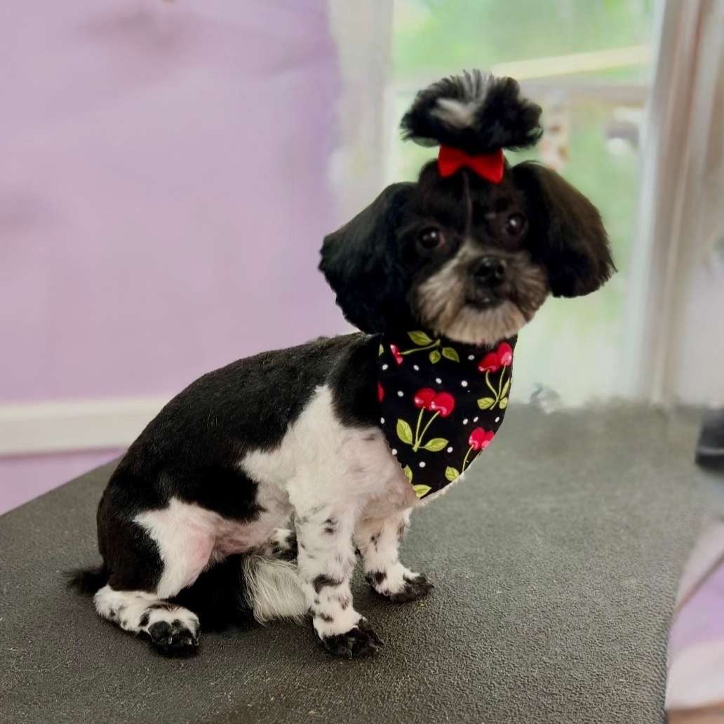 Full Groom is bath, brush, blow dry, and nail trim, potty patch trimming, eye shaping, and ear cleaning, all-over shaping/length altering